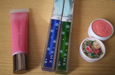 左からルナソルのグロス、今日発売のRMKのティントグロス、ラデュレのチーク……